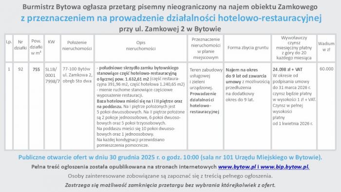 Burmistrz Bytowa ogłasza przetarg pisemny na najem obiektu Zamkowego z przeznaczeniem na prowadzenie działalności hotelowo-restauracyjnej przy ul. Zamkowej 2 w Bytowie.