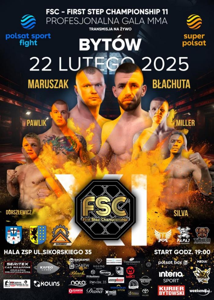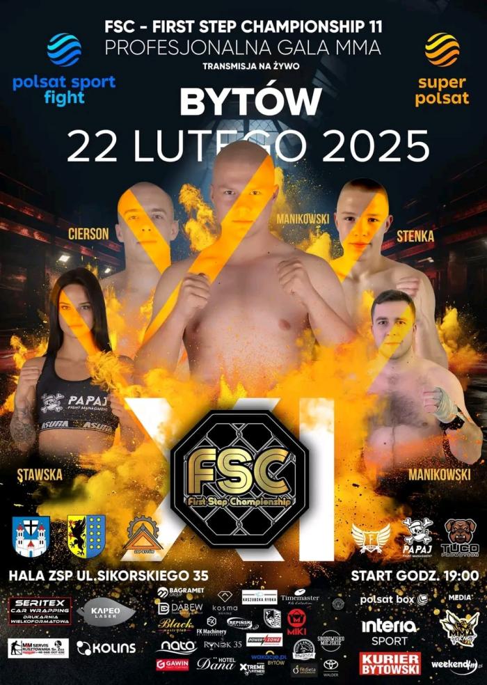 Poznaliśmy dokładny termin trzeciej bytowskiej gali mieszanych sztuk walki. First Step Championship 11, bo taką nazwę otrzymał event, odbędzie się w sobotę 22 lutego w sali sportowej Zespołu Szkół Ponadpodstawowych w Bytowie. - Zabawę zaczniemy o godz. 19.00. Pierwsze pojedynki krótko po otwarciu. Dopinamy już ostatnie szczegóły. Szykuje się wyjątkowo ciekawy wieczór – mówi Artur Smarzyński, promotor walk MMA i prezes Fight Clubu MMA Furia Bytów.
