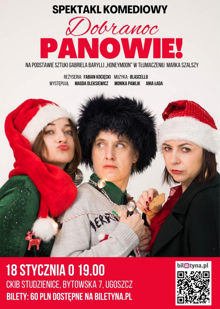 W 65-minutowym spektaklu „Dobranoc, panowie!” w reżyserii Fabiana Kocięckiego, na podstawie sztuki Gabriela Barylli „Honeymoon”, wystąpią Ania Łada, Magda Oleksiewicz i Monika Pawlik. Bilety w cenie 60 zł do nabycia na biletyna.pl.