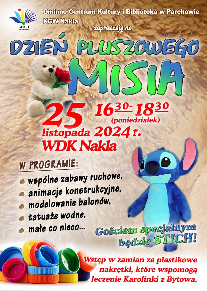 Gminne Centrum Kultury i Biblioteka w Parchowie zaprasza do Wiejskiego Domu Kultury w Nakli na Dzień Pluszowego Misia, który odbędzie się w poniedziałek 25 listopada o godz. 16.30. W programie wspólne zabawy ruchowe dla dzieci, animacje, modelowanie balonów, tatuaże wodne oraz poczęstunek. Gościem specjalnym będzie Stich, znany z filmów Disneya kosmiczny „pluszak". Wstęp wolny – organizatorzy zachęcają, by przynosić ze sobą plastikowe nakrętki, które trafią do pojemnika przed GCKiB Parchowo, a w przyszłości trafią na cele charytatywne. Wydarzenie wspierają panie z Koła Gospodyń Wiejskich w Nakli.