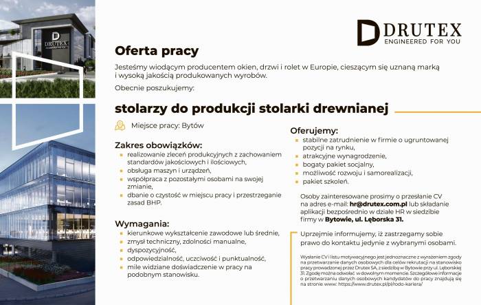Firma Drutex poszukuje stolarzy do produkcji stolarki drewnianej.