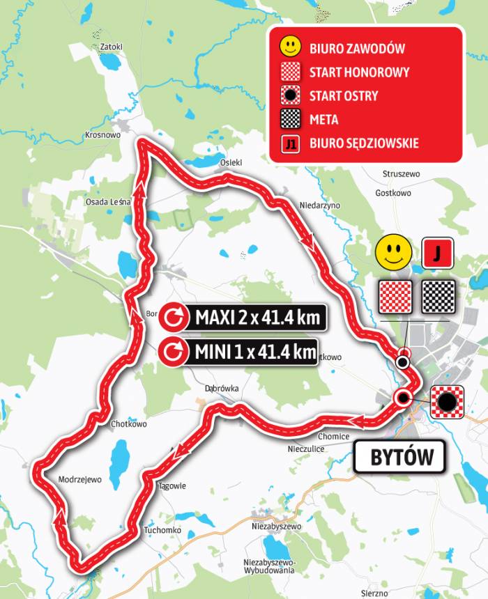 Dla kolarzy amatorów lubiących rywalizację na szosie Lang Team, główny organizator zawodów, przygotował dwa dystanse: maxi i mini. Trasę wyznaczono na pętli o długości 41,4 km, którą kolarze będą musieli pokonać raz lub dwa razy w zależności od wybranego przez siebie dystansu. Start i meta znajdować się będą na ul. Mickiewicza w Bytowie (na wysokości stadionu). Stamtąd, począwszy od godz. 11.00, rozstawieni w sektorach kolarze ruszą na trasę. Skierują się w ul. Sikorskiego, następnie Kochanowskiego i Tartaczną, by wjechać na ul. Szarych Szeregów, gdzie nastąpi start ostry. Zawodnicy przejadą przez Dąbrówkę, Tągowie i Tuchomko, a za nim na skrzyżowaniu dróg pojadą w prawo przez Modrzejewo i Chotkowo, by dotrzeć do Borzytuchomia, Tam wjadą w drogę na Krosnowo, by dotrzeć do głównej drogi i przez Osieki, Niedarzyno i Grzmiącą skierować się do Bytowa, do którego wjadą od strony Przyborzyc.