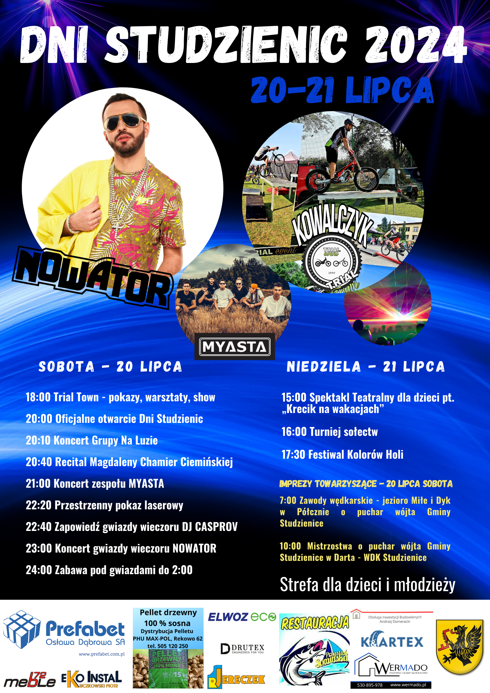 Święto gminy Studzienice rozpocznie się w sobotę 20 lipca o godz. 18.00 na miejscowym stadionie. Na początek Trial Town, czyli rowerowe miasteczko z pokazami, popisami i warsztatami, a potem koncerty. Wystąpią m.in. grupa Na Luzie (była też przed rokiem), Magdalena Chamier Ciemińska i zespół MYASTA, czyli kilkuosobowa brygada z Bydgoszczy i okolic z wielką pasją do tworzenia muzyki. Po niej w Studzienicach zobaczymy profesjonalny przestrzenny pokaz laserowy (w miejsce dotychczasowego pokazu sztucznych ogni), a godz. 23.00 na scenę wkroczy gwiazda wieczoru, czyli Nowator ze swoim dyskotekowym repertuarem.