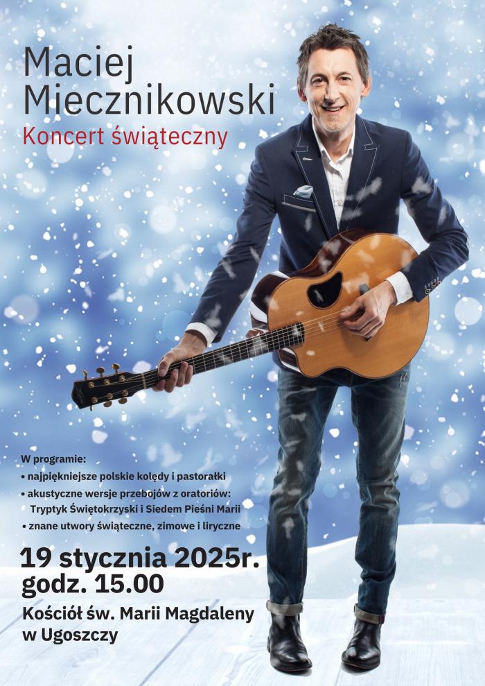 Parafia św. Marii Magdaleny w Ugoszczy zaprasza w niedzielę 19 stycznia na koncert świąteczny Macieja Miecznikowskiego, śpiewaka operowego, piosenkarza (był wokalistą zespołu Leszcze), multiinstrumentalisty (gra na fortepianie, gitarze, akordeonie i trąbce) i prezentera telewizyjnego. W programie koncertu w kościele w Ugoszczy: kolędy i pastorałki, akustyczne wersje przebojów z oratoriów Tryptyk Świętokrzyski i Siedem Pieśni Marii, utwory świąteczne, zimowe i liryczne.