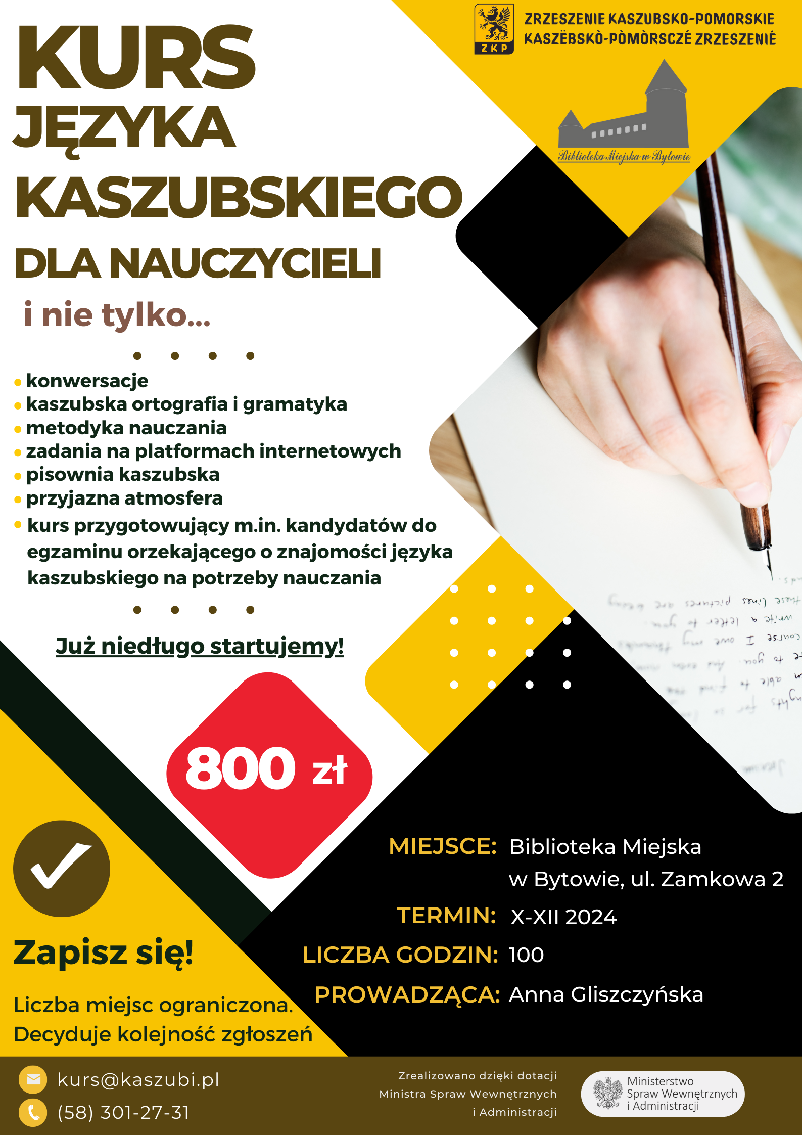 Kurs języka kaszubskiego realizowany przez Zrzeszenie Kaszubsko-Pomorskie przy wsparciu Ministerstwa Spraw Wewnętrznych i Administracji skierowany jest do nauczycieli przygotowujących się do egzaminu ze znajomości języka kaszubskiego, jak również osób posiadających już takie uprawnienia lub chcących doskonalić znajomość języka kaszubskiego. Zajęcia odbywać się będą od początku października do końca grudnia w Bibliotece Miejskiej w Bytowie, która jest partnerem projektu.
