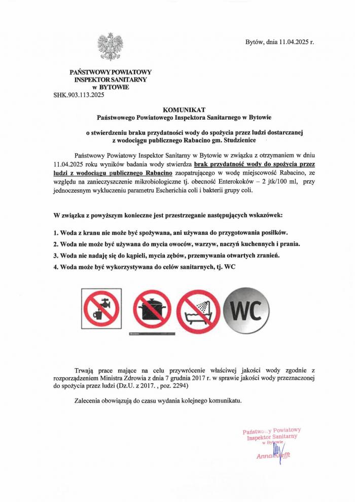 Sprawa wynikła podczas rutynowej kontroli prowadzonej przez Stację Sanitarno-Epidemiologiczną w Bytowie. W piątek 11 kwietnia sanepid przekazał, że woda dostarczana z wodociągu w Rabacinie nie nadaje się do spożycia. Badania wykazały obecność Enterokokoków.