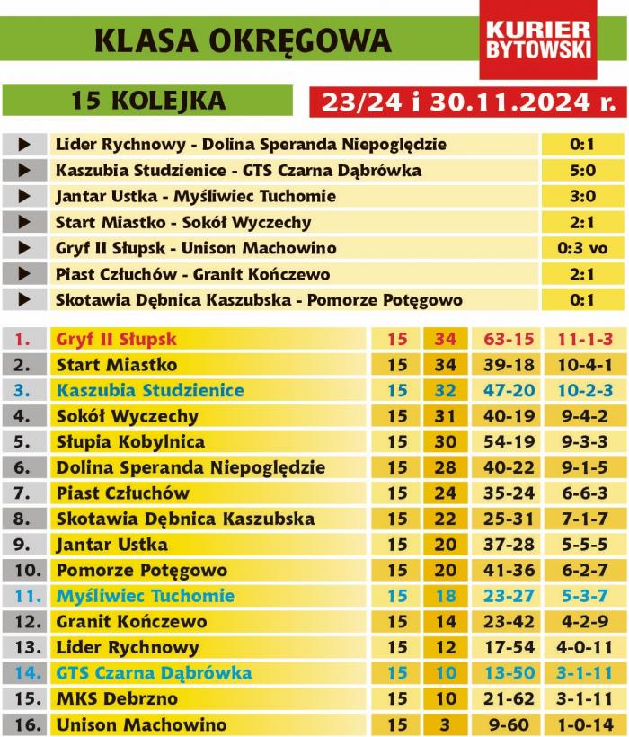 W słupskiej klasie okręgowej tym razem rejon bytowski reprezentowany był przez 3 ekipy. Na pewno udaną rundę zanotowała Kaszubia Studzienice. Zespół prowadzony przed duet trenerski Karol Szymlek – Krzysztof Miąskowski wygrał 7 z ostatnich 8 meczów i ostatecznie jesień zakończył na 3 pozycji, mając tylko 2 pkt. straty do liderów – Gryfa II Słupsk i Startu Miastko. W meczach z najsilniejszymi rywalami studzieniczanie pokonali słupszczan 2:0 i Słupię Kobylnica 3:1, zremisowali z Sokołem Wyczechy 1:1 i przegrali tylko ze Startem 0:2. Kto wie, może wiosną Kaszubia zawalczy o miejsce dające jej co najmniej prawo gry o barażach o IV ligę.