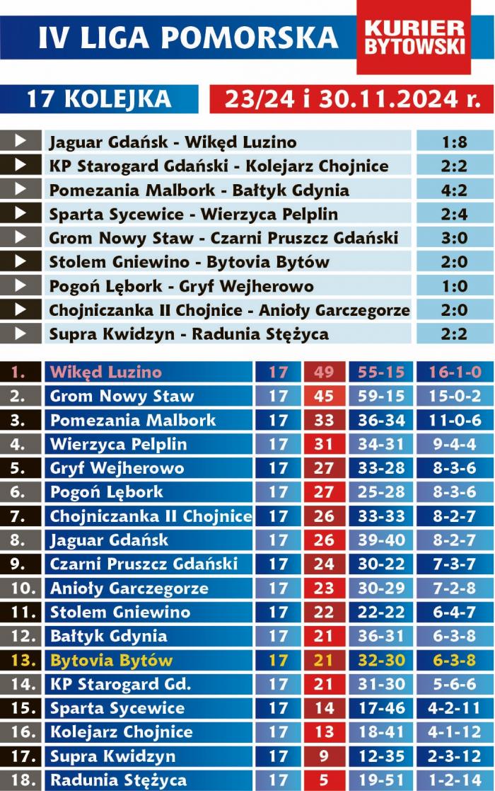 Bytovia Bytów jest jedyną drużyną powiatu bytowskiego w IV-ligowych rozgrywkach. Beniaminek z Bytowa, który na ten szczebel wrócił po roku, w 17 meczach zgromadził 21 pkt. Mogło być więcej, ale drużynie trenera Tomasza Bąkowskiego nie wyszła końcówka rundy. W 5 ostatnich meczach zgromadziła jedynie 3 pkt. (wygrana z Pomezanią Malbork) i rundę jesienną zakończyła na 13 miejscu. Póki co, trudno mówić, że Bytovii grozi spadek, bo ten automatycznie dotknie tylko 3 ostatnie ekipy. Liczba ta może ulec zwiększeniu lub zmniejszeniu w zależności od tego, ile drużyn awansuje do III ligi z IV ligi pomorskiej (maksymalnie mogą dwie) i ile zespołów III-ligowych z województwa pomorskiego spadnie do IV ligi.