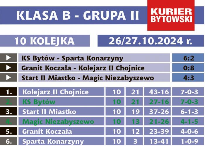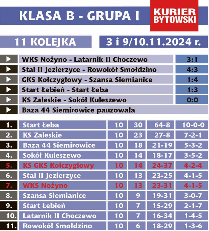 Niecodzienna sytuacja wytworzyła się w słupskiej klasie B. W grupie I jest 11 zespołów, w II tylko 6. Stało się tak po tym, jak o przypisanie do grupy obejmującej północną część podokręgu słupskiego wnioskowały GKS Kołczygłowy i WKS Nożyno. Do tego do rozgrywek dopuszczono ekipę Latarnika II Choczewo z „gdańskiej" części województwa. W grupie II grania nie było jednak zdecydowanie mniej, bo zespoły mierzyły się tzw. systemem szkockim, w jednej rundzie rozgrywając mecz i rewanż. Z czterech B-klasowych zespołów rejonu bytowskiego szanse na awans do klasy A ma jedynie KS Bytów. Szansę stracił już Magic Niezabyszewo, bo mając na koncie aż 5 porażek, nie sposób wygrać rozgrywek. Przypomnijmy, że do klasy A awansują zwycięzcy obu grup, a drużyny z drugich miejsc dostaną szansę w barażach.