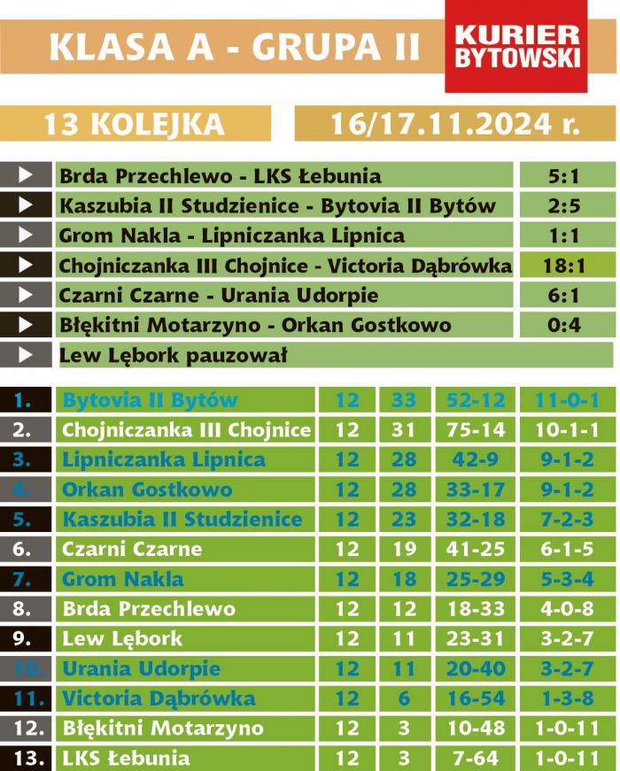 Aż 7 drużyn rejonu bytowskiego gra w grupie II klasy A. 13-zespołowej stawce po rundzie jesiennej przewodzi Bytovia II Bytów trenera Mateusza Krolla. Najważniejszy dla bytowiaków mecz odbył się 10 listopada, gdy podejmowali lidera – Chojniczankę III Chojnice. Wygrali piłkarze rezerw Bytovii 3:1 i wskoczyli na czoło tabeli. W grze o premiowane awansem do okręgówki miejsce lub drugą lokatę, dającą prawo gry w barażach o awans, pozostają dwie inne ekipy Ziemi Bytowskiej – Lipniczanka Lipnica i Orkan Gostkowo. Obie drużyny mają 5 pkt. straty do bytowiaków.