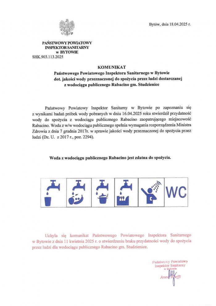 Na szczęście udało się przywrócić odpowiednią jakość wody w wodociągu. Studzienicki samorząd przed chwilą powiadomił mieszkańców Rabacina o tym fakcie, publikując komunikat Państwowego Powiatowego Inspektora Sanitarnego w Bytowie.