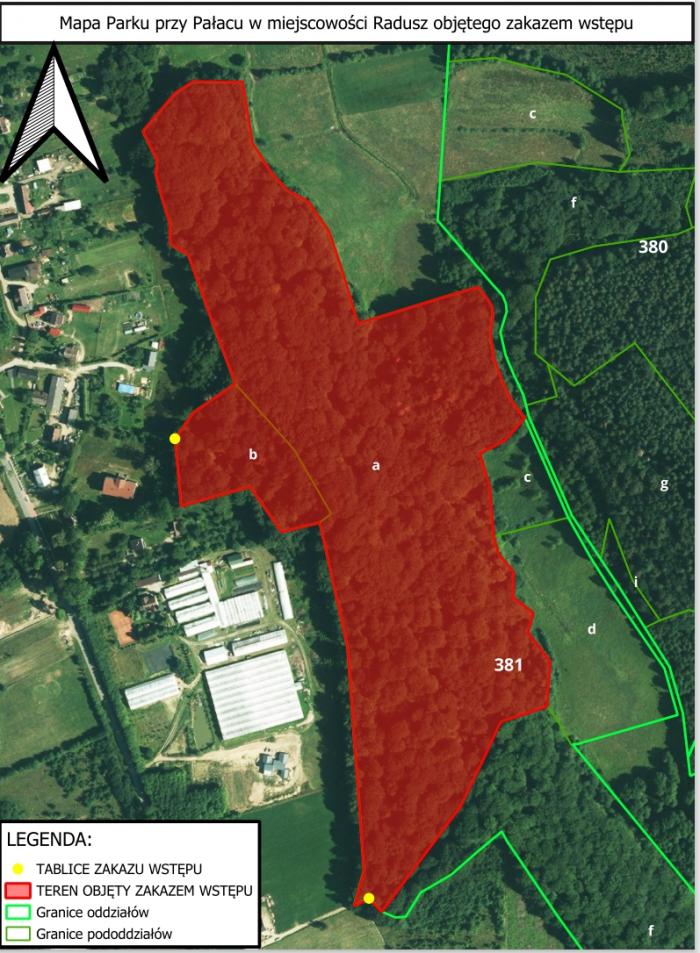 Zakaz obowiązywał do 15 grudnia 2024 r. Teraz nadleśniczy Nadleśnictwa Leśny Dwór wprowadził kolejny zakaz okresowy wstępu do lasu w oddziale 381 leśnictwa Barnowo – park przy pałacu w Raduszu. Ma on obowiązywać od 16 grudnia 2024 r. do 15 grudnia 2025 r. Miejsca potencjalnych wejść na teren parku oznakowane zostały tablicami „zakaz wstępu”.