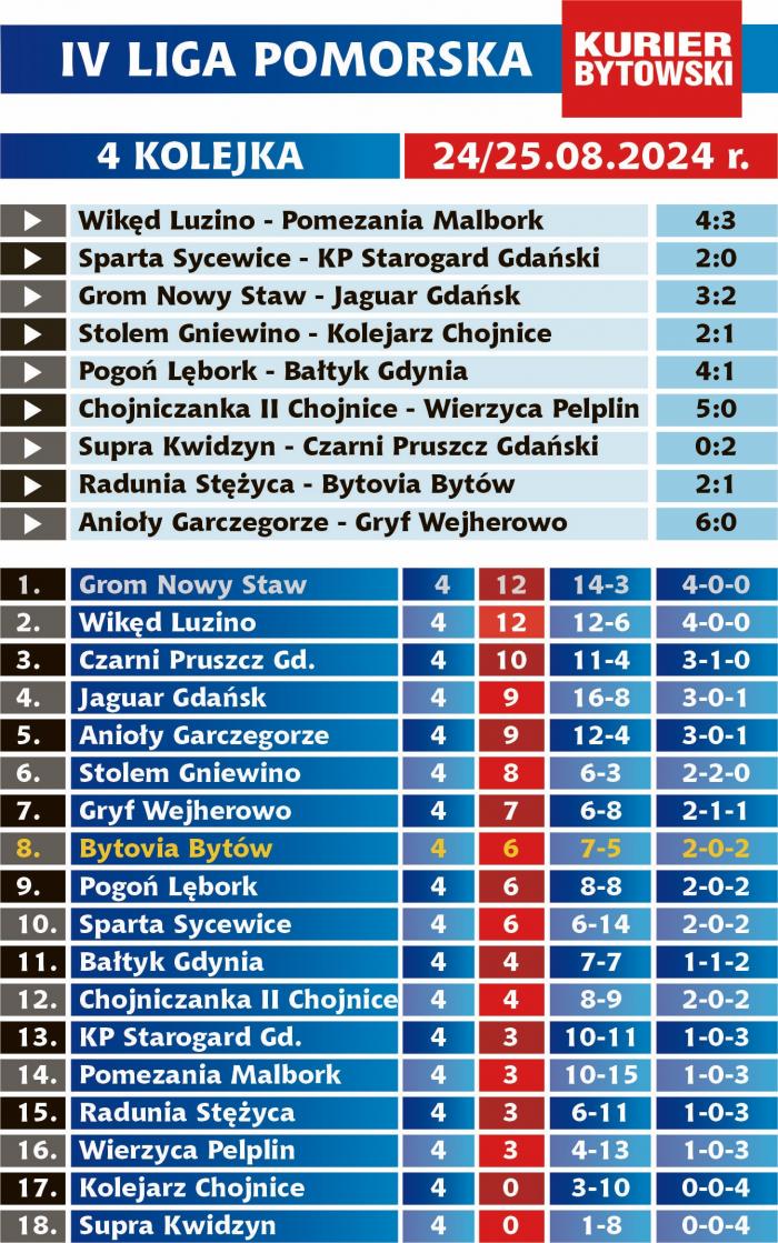 W spotkaniu czwartej kolejki IV ligi pomorskiej Bytovia Bytów przegrała z Radunią Stężyca 1:2. Honorowego gola zdobył Dawid Kiełpiński.