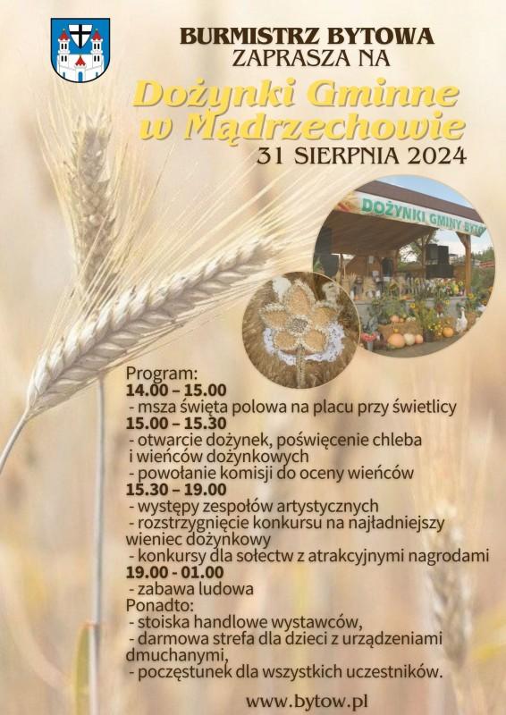 Tegoroczne dożynki gminy Bytów odbędą się w sobotę 31 sierpnia na placu rekreacyjno-sportowym w Mądrzechowie.