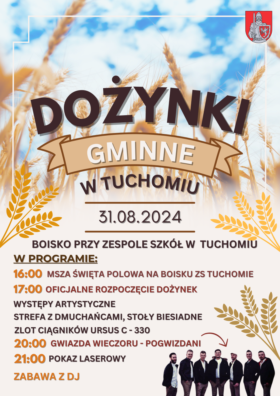 Tegoroczne święto plonów w gminie Tuchomie odbędzie się w sobotę 31 sierpnia na boisku przy szkole w Tuchomiu. Rozpocznie je o godz. 16.00 polowa msza św. Po niej oficjalne rozpoczęcie uroczystości, występy artystyczne, zlot ciągników Ursus C-330, biesiadowanie, a dla dzieci strefa z dmuchańcami. O godz. 20.00 zaplanowany jest występ zespołu Pogwizdani z Łącka k. Nowego Sącza, łączącego tradycyjnie góralskie melodie ze współczesnym brzmieniem i ciekawymi aranżacjami, a potem pokaz laserowy i zabawa z DJ-em.