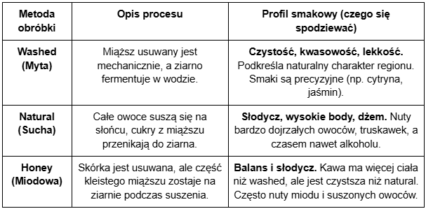 "Processing" to kluczowy etap między zerwaniem wiśni kawowej a jej wysłaniem do palarni. Sposób, w jaki ziarno zostało oddzielone od miąższu i wysuszone, ma gigantyczny wpływ na to, co poczujesz w kubku. Dla wielu baristów jest to ważniejsza informacja niż sam region pochodzenia. Poniższa tabela pomoże Ci szybko zrozumieć różnice: