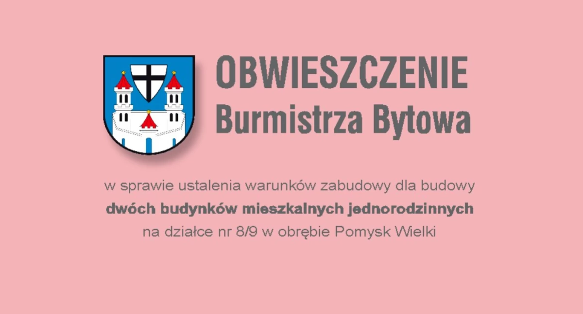 informuje, że w dniu 3 stycznia 2024 r. zostało wszczęte postępowanie administracyjne w sprawie ustalenia warunków zabudowy dla inwestycji polegającej na budowie dwóch budynków mieszkalnych jednorodzinnych na działce nr 8/9 w obrębie Pomysk Wielki, gm. Bytów. Planowana inwestycja zlokalizowana jest w obszarze Natura 2000 PLH 220005 „Bytowskie Jeziora Lobeliowe”.