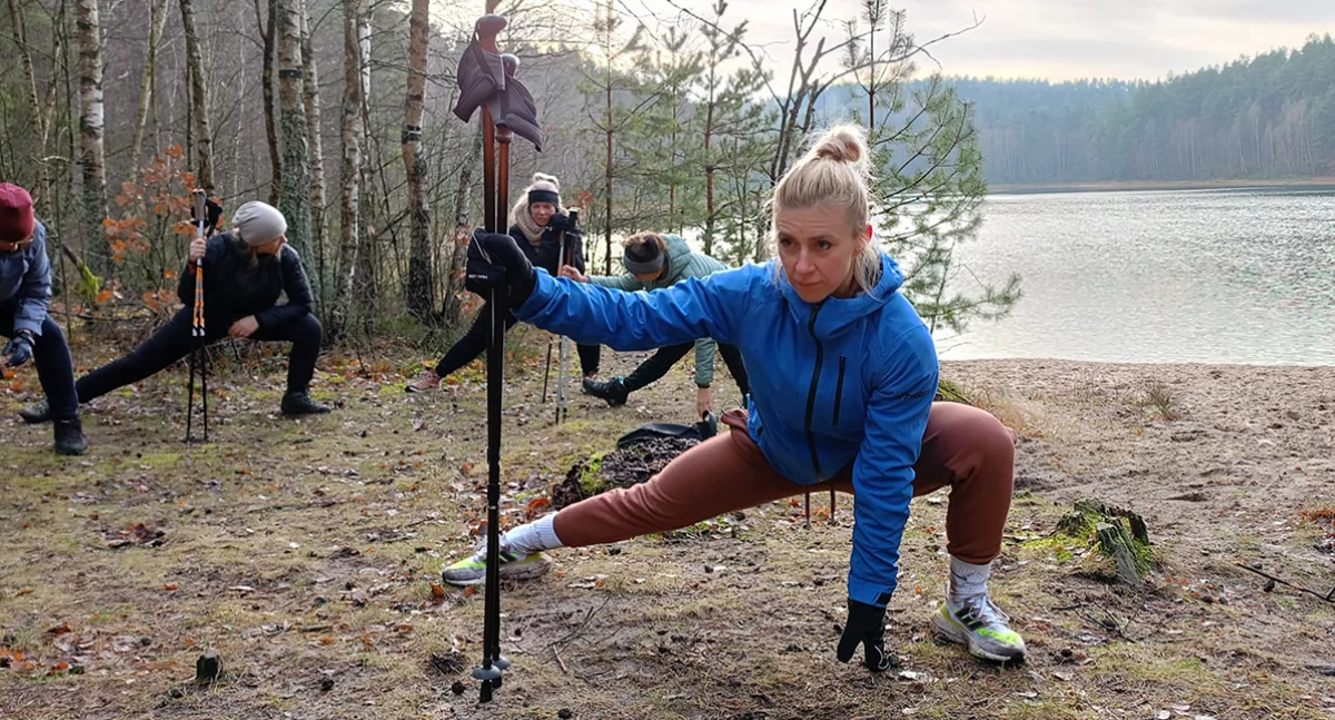 Na ostatni trening w roku, który miał być „czerwony", trener zaprosił Katarzynę Klaman, medalistkę mistrzostw Europy i świata w kulturystyce (kategoria Body Fitness), radną powiatową i właścicielkę Fabryki Zdrowia. Po rozgrzewce grupa ruszyła na Górę Siemierzycką i ją „zdobywała" aż pięciokrotnie (jedno spokojne i cztery szybkie podejścia). Niektórym było to za mało i dołożyli sobie jeszcze jedno wejście. - Na szczycie wykonaliśmy tabatę z ośmioma 20-sekundowymi ćwiczeniami na pełnych obrotach – mówi trener. Po zejściu z góry ekipa została podzielona na mniejsze grupy, aby wykonać fartleki z wyprzedzaniem. - Uczestnicy ćwiczenia idą jeden za drugim. Zadaniem ostatniego zawodnika w grupie jest wyprzedzenie wszystkich. Gdy dojdzie na początek stawki, zwalnia tempo, po to, aby kolejna osoba mogła z ostatniego miejsca przejść na początek – wyjaśnia Bogdan Adamczyk. Następnie były luźne ćwiczenia w parach i marsz w średnim tempie przeplatany szybkimi zrywami. Na koniec nad jeziorem Katarzyna Klaman zaserwowała zestaw ćwiczeń rozciągających przydatnych dla nordicowców.