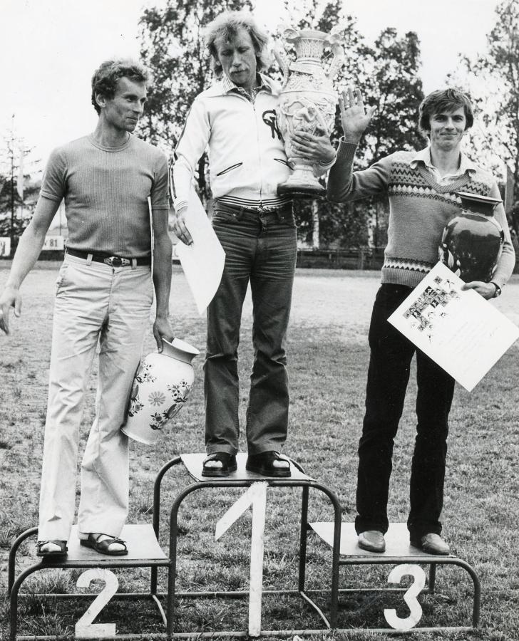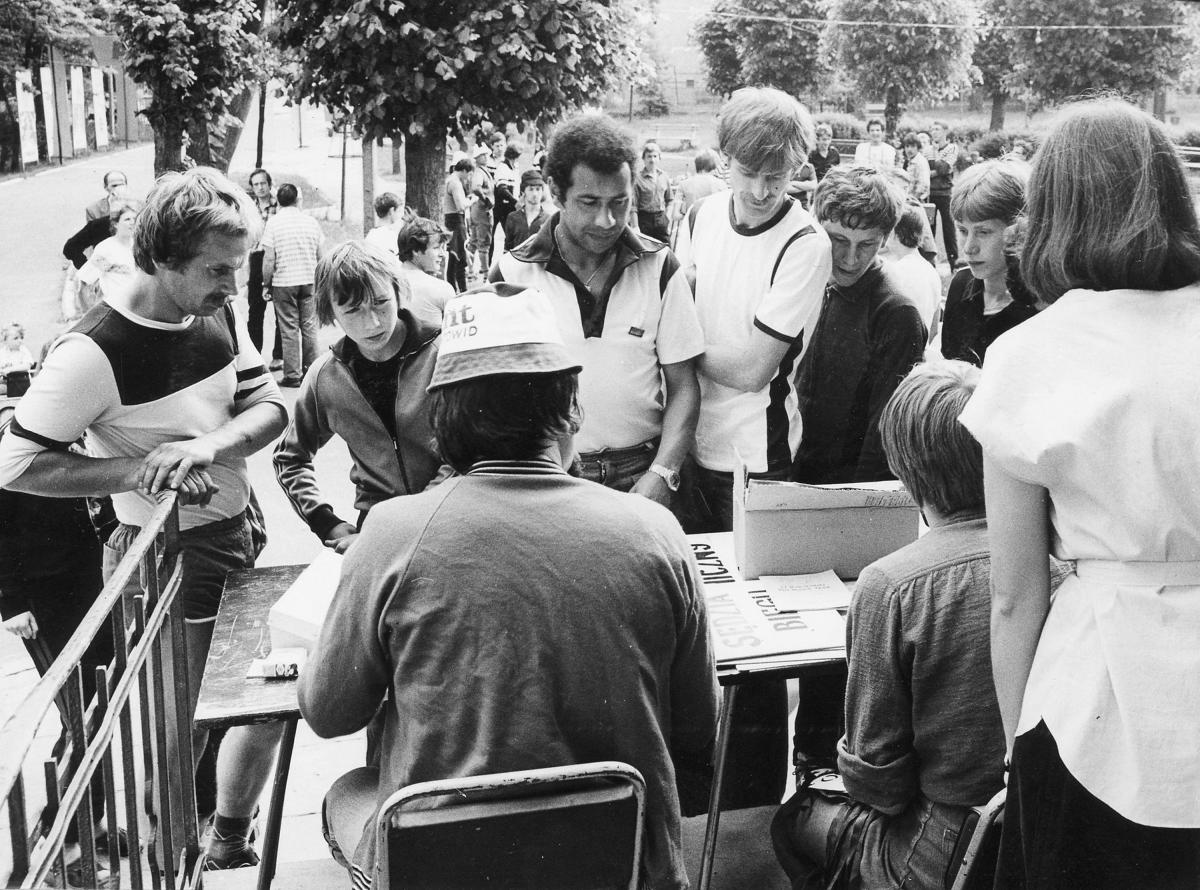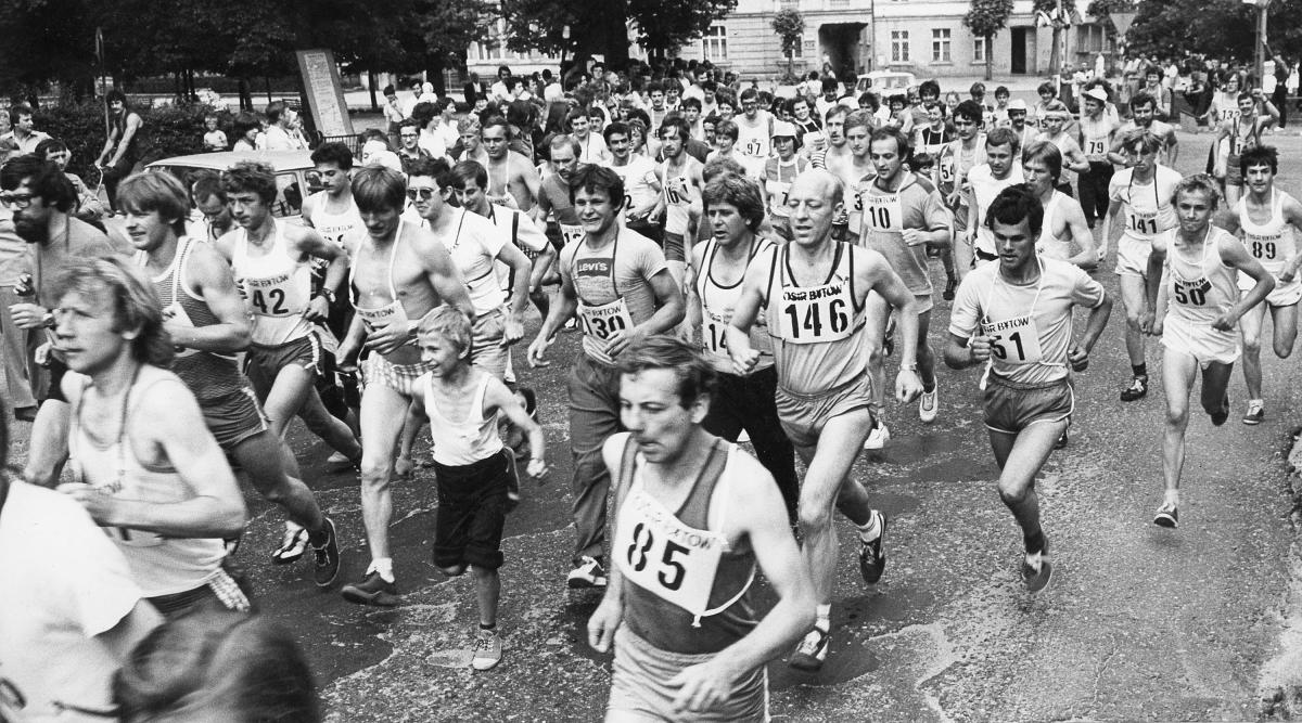 Najlepsi zawodnicy I Masowego Biegu Gochów. Na najwyższym stopniu podium Ryszard Marczak z Zawiszy Bydgoszcz, który w 1981 r. został mistrzem Polski w maratonie. Obok niego: Kazimierz Bąk (z lewej) i Leszek Bierkus z Gdyni. Obaj wrócili w następnych latach do Bytowa i wygrali Bieg Gochów odpowiednio w 1982 i 1983 r. Start do I Masowego Biegu Gochów w 1981 r. Przyjmowanie zgłoszeń w sekretariacie biegu na bytowskim OSiR-ze. Henryk Pliszka z Człuchowa z 13-letnią córką Katarzyną zajęli odpowiednio 42 i 43 miejsce. W następnych latach na Bieg Gochów przyjeżdżali wielokrotnie, a Katarzyna już w 1982 r. wygrała klasyfikację kobiet.